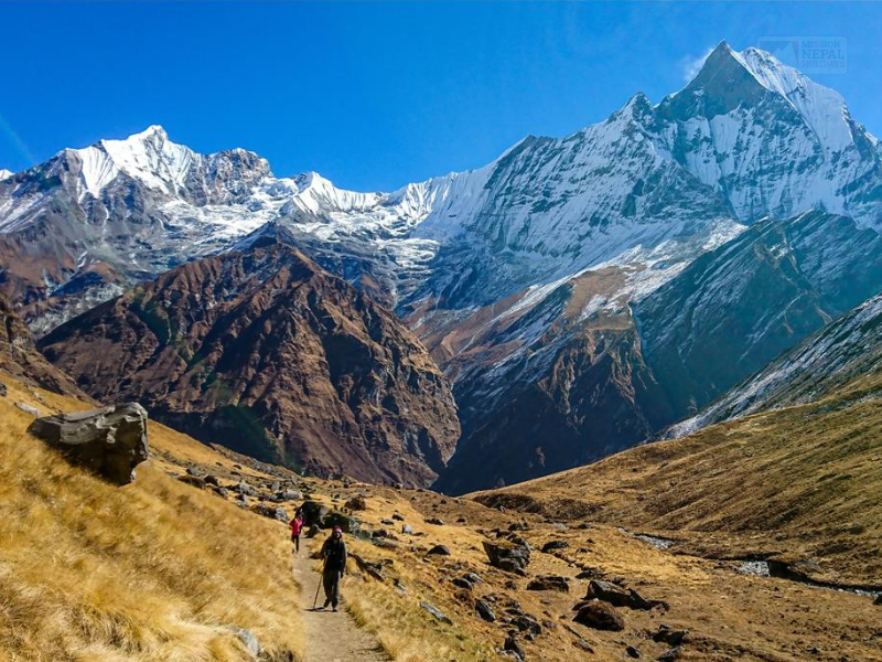 The trek’s ultimate destination is Mount Annapurna Base Camp, located at an altitude of 4,130 meters (13,549 feet), at the foot of the world’s tenth-highest peak. Along the way, trekkers also witness the spectacular Machhapuchhre (Fishtail) Mountain, one of Nepal’s most stunning and iconic peaks.